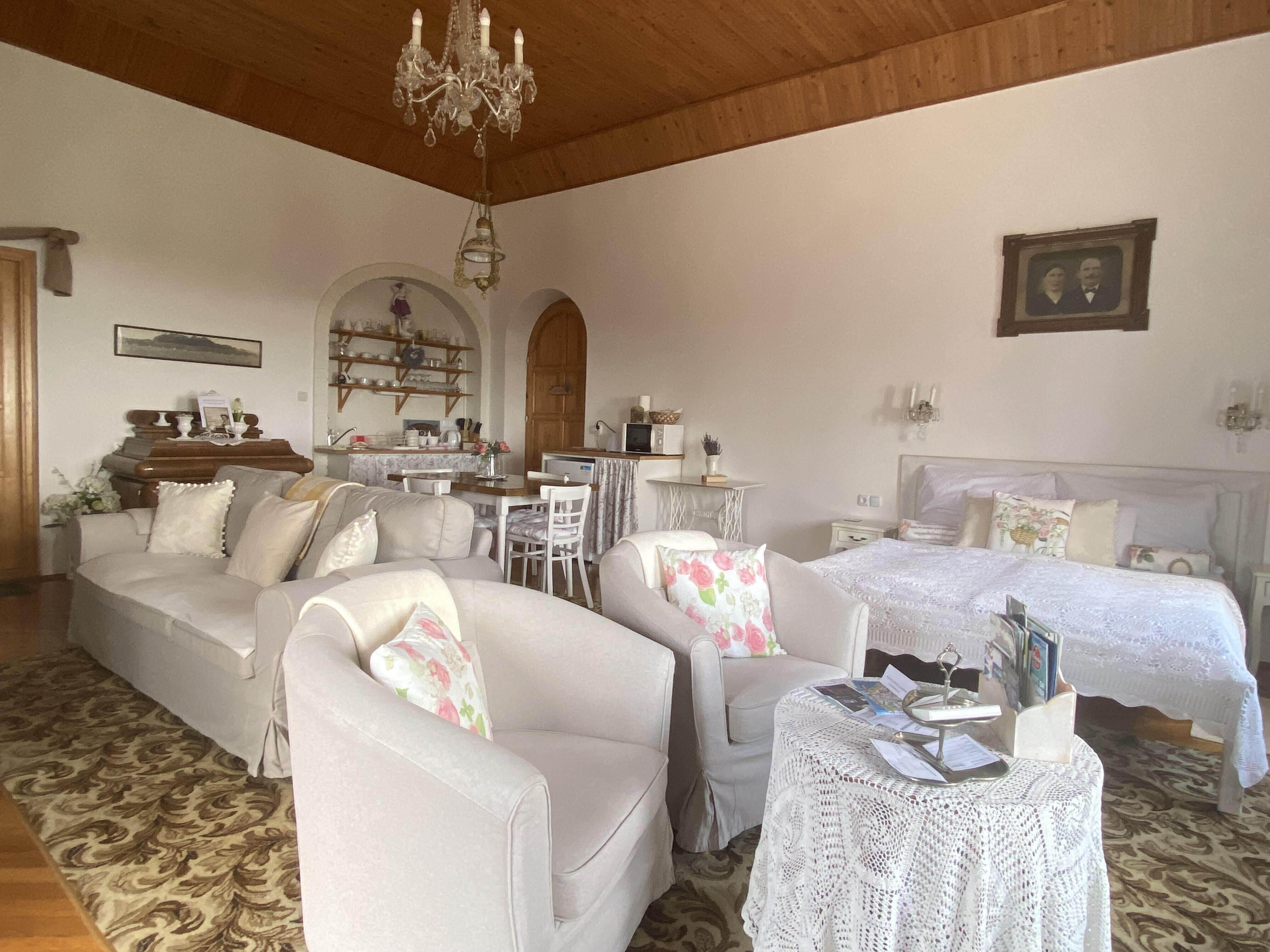 Szállóvendégeinket egy pazar, franciaágyas (160 cm széles) hálószoba várja, valamint a nappaliban egy dupla ágy (nem széttolható). A pótágy vagy a babágy bármelyik szobában elfér. Mindkét hálóhelyiségben van légkondicionáló, melyek külön irányíthatóak. A szobák antik és vintage bútorokkal ill. kiegészítőkkel vannak berendezve, előkelő, mégis barátságos hangulatot tükröznek, és mindegyikből gyönyörű kilátás nyílik a Balatonra. A szobákban vállfákkal ellátott ruhásszekrények találhatók, akasztós és polcos részekkel. Nagy tér, friss levegő, csendes, nyugodt környezet valamint kényelmes fekhelyek segítik a teljes relaxációt.